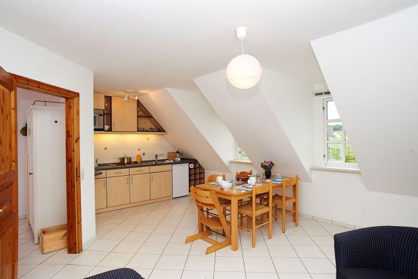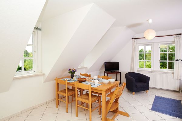 Blick in die große Ferienwohnung im Obergeschoss. Diese Wohnung hat ein separates Schlafzimmer. Im Wohn- und Esszimmer steht eine ausklappbare Schlafcouch.